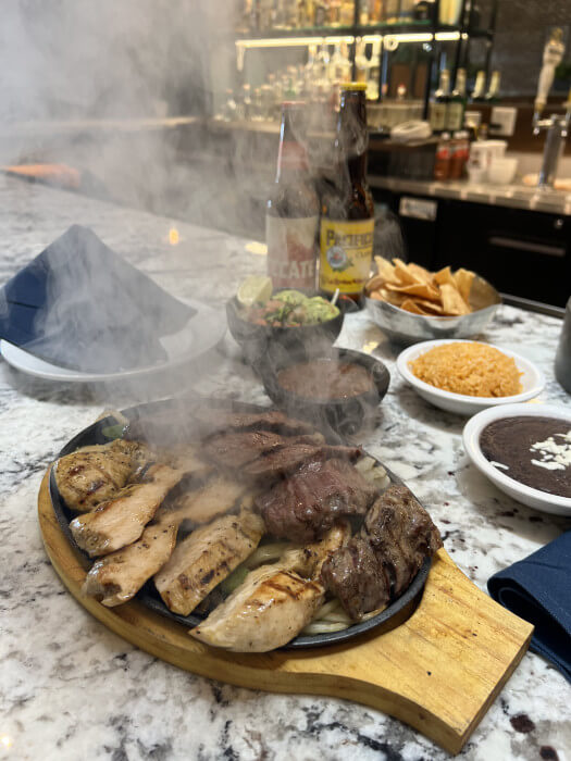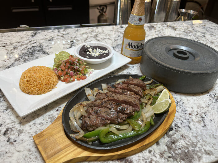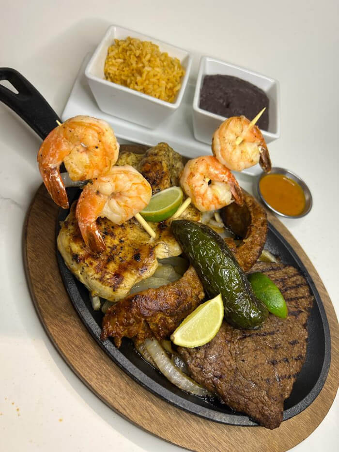 8 oz. Angus grilled beef, 8 oz grilled chicken, 4 jumbo shrimp, Mexican chorizo, jalapeno toreado, served over sauteed onions/bell peppers, Mexican rice, refried beans, corn tortillas. (enough for sharing)