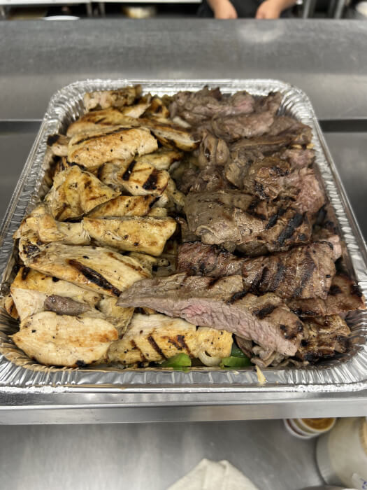 Chicken breast and Angus hand trimmed beef skirt steak (fajitas) served over grilled onions/bell peppers, Mexican rice, charro beans, corn and flour tortillas. Pico, guacamole and lettuce on the side. FEEDS 4-5 people