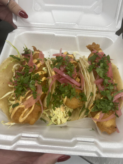 Fried beer battered white Fish, shredded cabbage, cilantro, and our chipotle / mayo dressing. lime and salsa on the side.