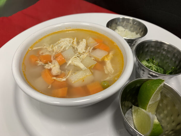 A traditional chicken broth soup with shredded chicken, rice, veggies. Diced fresh onions and cilantro on the side.