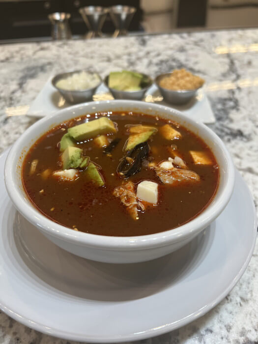 Authentic Tortilla soup flavored with a blend of dried peppers. diced onions, chicharron, Mexican cream, avocado and fresco cheese on the side.