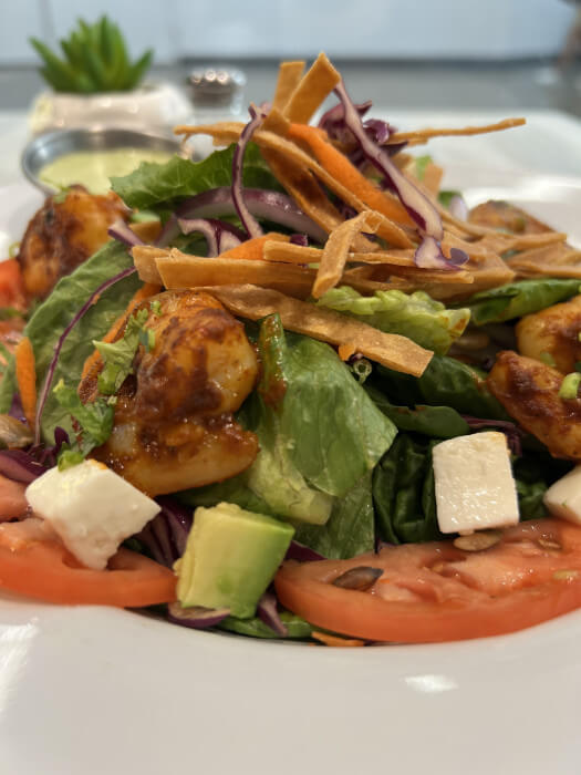 Romaine lettuce, fresh red onion, fresh tomatoes, avocado, fresco cheese, whole beans, corn, roasted poblano, pumpkin seeds, homemade cilantro dressing. (no meat included) Add grilled Beef, Chicken or Shrimp as an upgrade