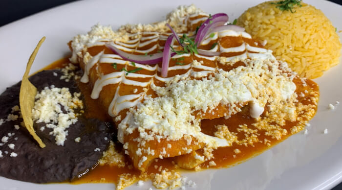 Green tomatillo or Red salsa, filled with your choice of meat (make your selection), topped with Mexican cream, fresco cheese, onion Rice and black refried beans on the side