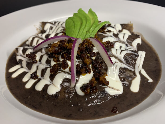 [3] Stuffed with Shredded chicken, covered with our signature handcraft black beans sauce, topped with Mexican cream, chorizo and fresco cheese.