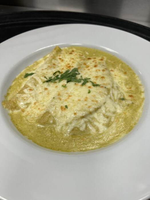 Layers of corn tortillas, filled with rajas poblanas and chicken, covered in a creamy poblano sauce, topped with melted cheese. (no rice or beans included)