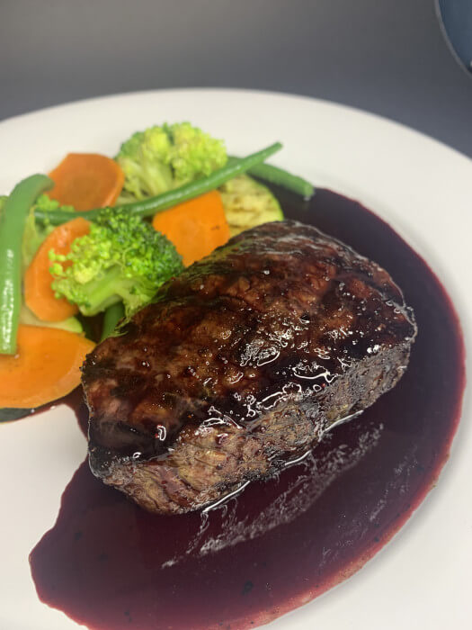 8 Oz. Angus Beef Sirloin Center Cut w/Strawberry / Red Wine reduction glaze, sautéed veggies