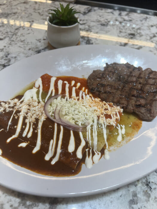 [3] Stuffed with your choice of: grilled chicken or cheese, covered each of them with different salsa (red, green, mole) topped with Mexican cream, fresco cheese. Rice and 4 Oz of Skirt Steak on the side.