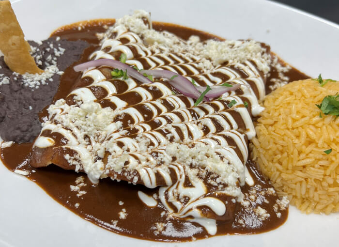 [3] stuffed with shredded chicken, covered with our signature handcraft mole sauce, topped with Mexican cream and fresco cheese. Rice and beans